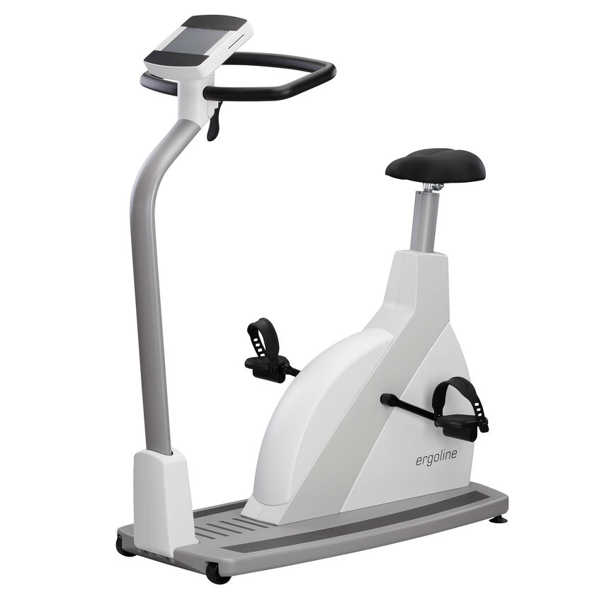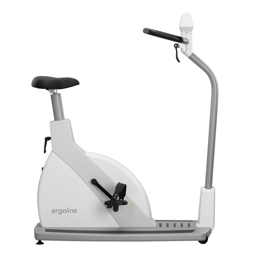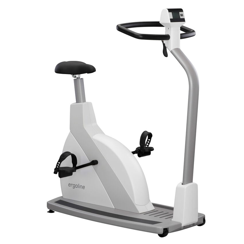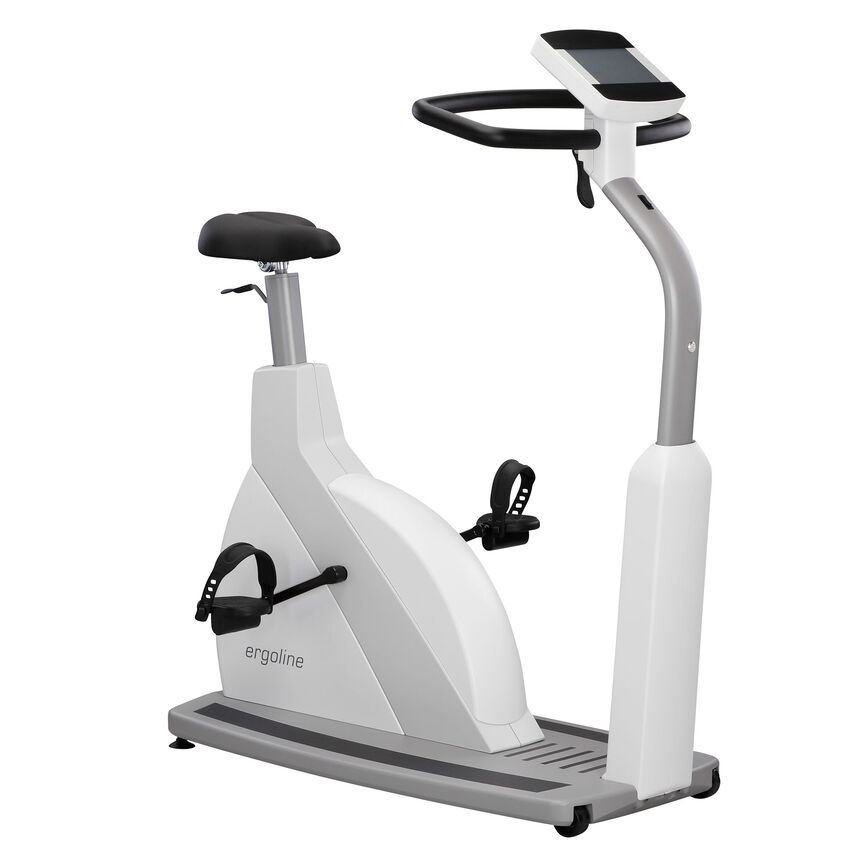 The new high-quality, modular ergometer series by ergoline combines state-of-the-art technology and exclusive design into a convincing overall concept. The medical high-performance ergometers of the ergoline 5 series stand for highest quality, full commitment to user needs, and limitless functionality. This ergometer is characterized by its wide, open step-through frame, extremely low access height, and solid aluminum platform.